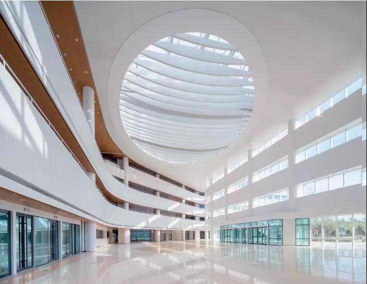 由于院區(qū)用地呈不規(guī)則的梭形,且用地處于西側(cè)城市主要交通與東側(cè)居住區(qū)的過渡區(qū)域,方案創(chuàng)新性地引入“城市客廳”的設(shè)計理念,用地中心位置的開敞共享公共大廳不僅作為與城市、居住區(qū)進(jìn)行空間對話的形象節(jié)點,而且將整個院區(qū)各功能自然地整合在一起。