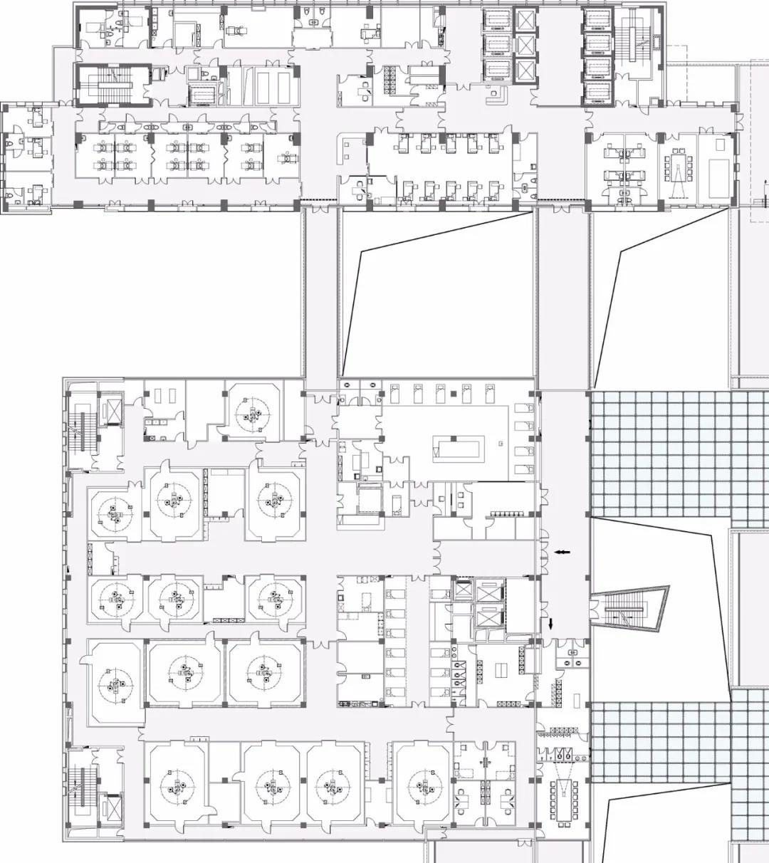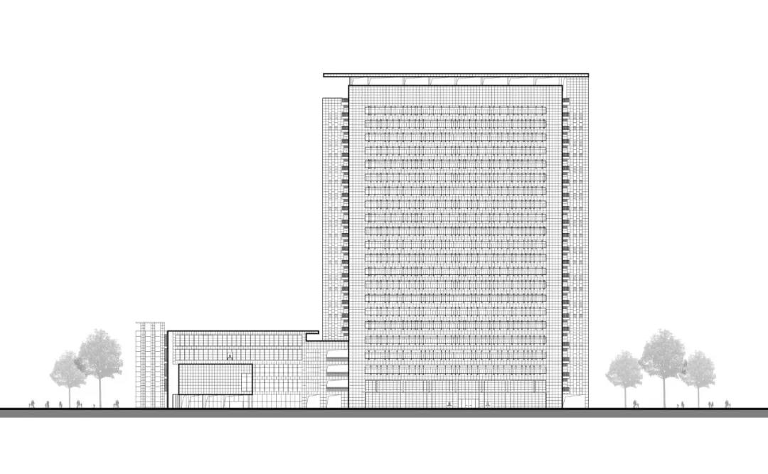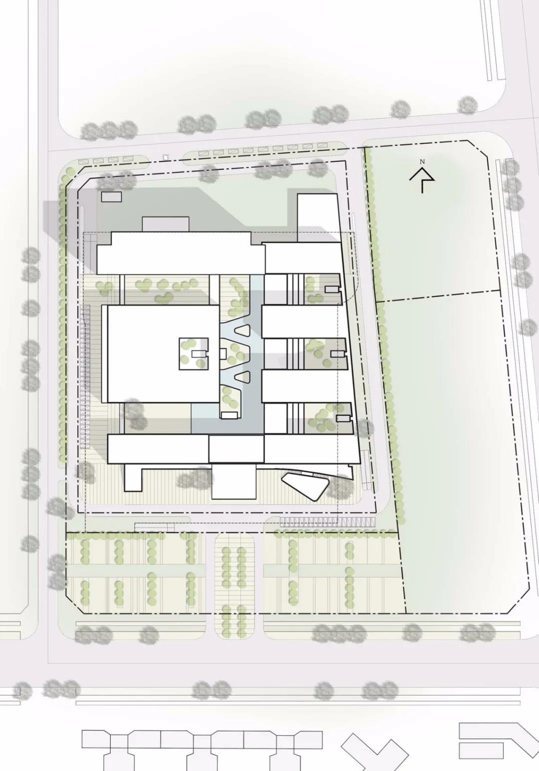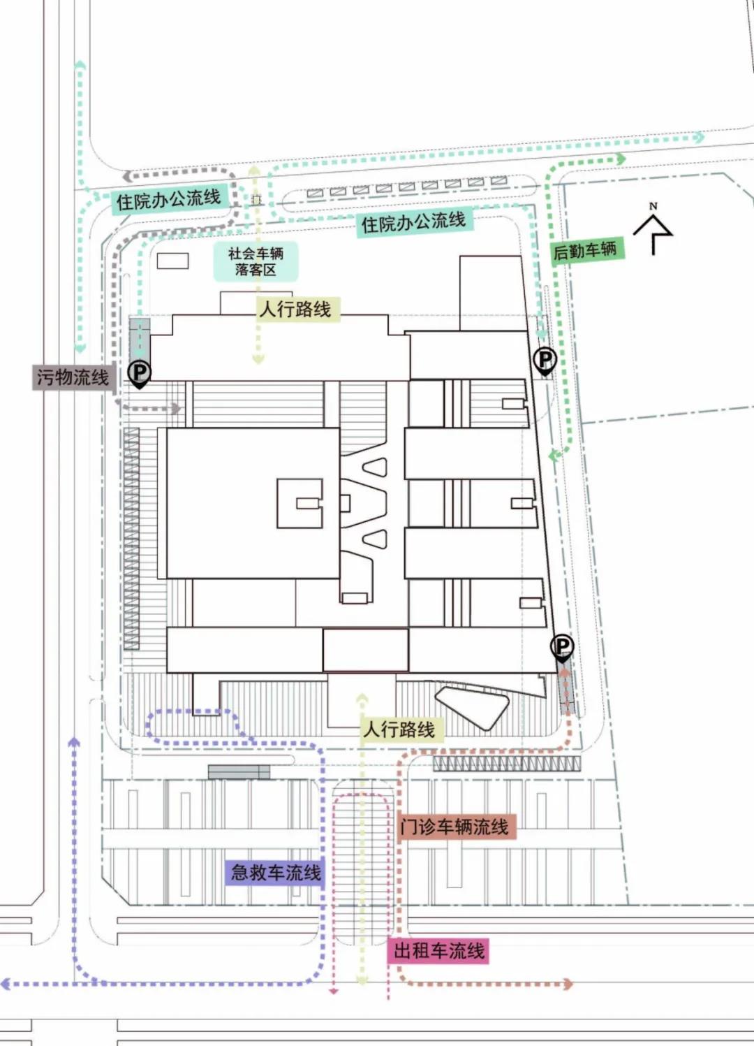 CAPOL負(fù)責(zé)進(jìn)行從方案到施工圖全過(guò)程的建筑設(shè)計(jì)總承包工作,創(chuàng)造性地采用“緊湊型三角形結(jié)構(gòu)”:以醫(yī)療技術(shù)部門為核心,門診部將布置在人流較多的城市主干道,住院部是遠(yuǎn)離城市主干道和噪音源的。三角形布局形成的最短會(huì)診、急救流線和分層掛號(hào)系統(tǒng),創(chuàng)造出了高效的就醫(yī)體驗(yàn)。