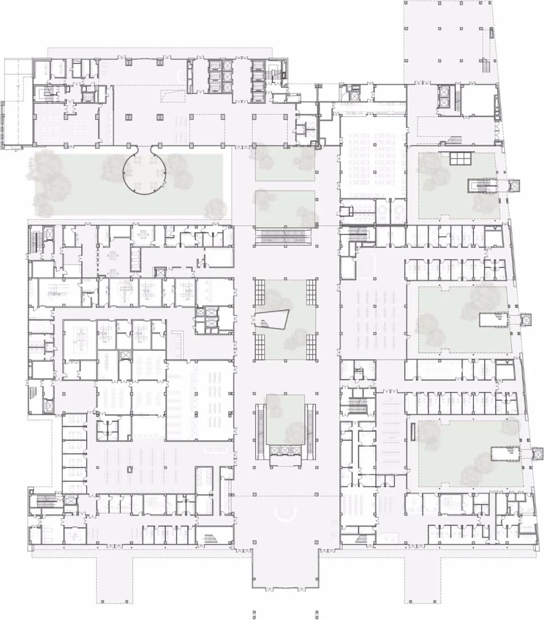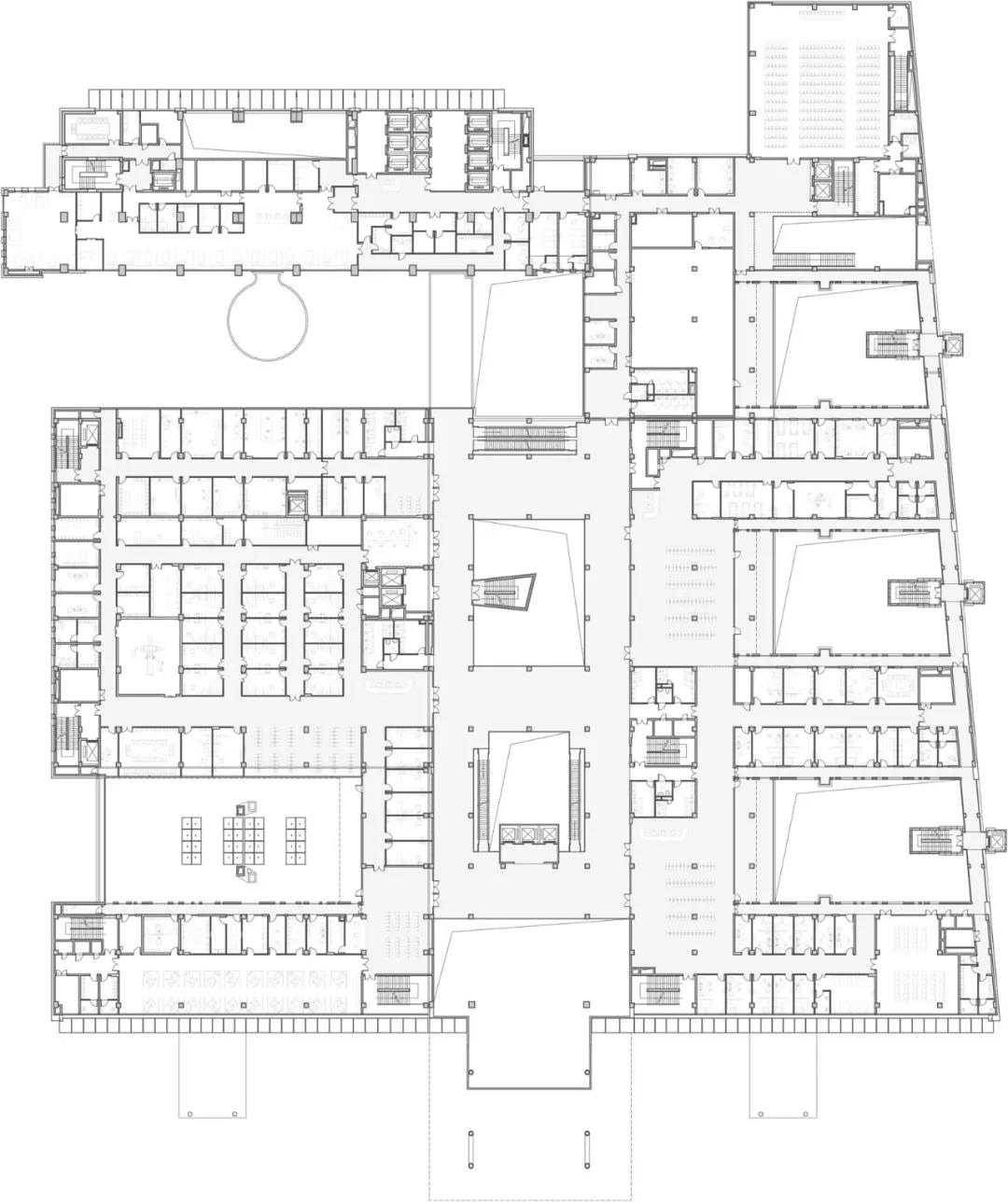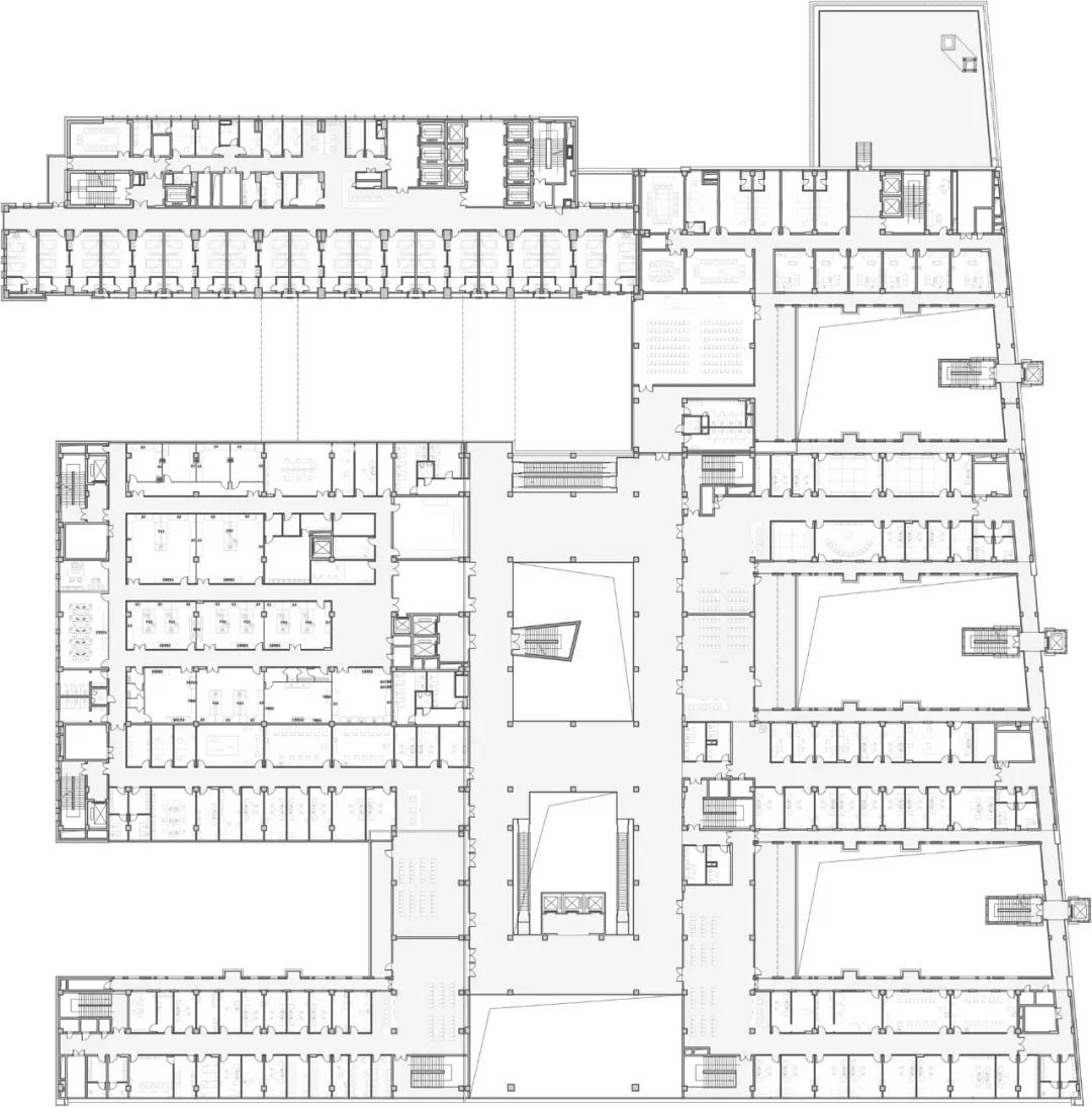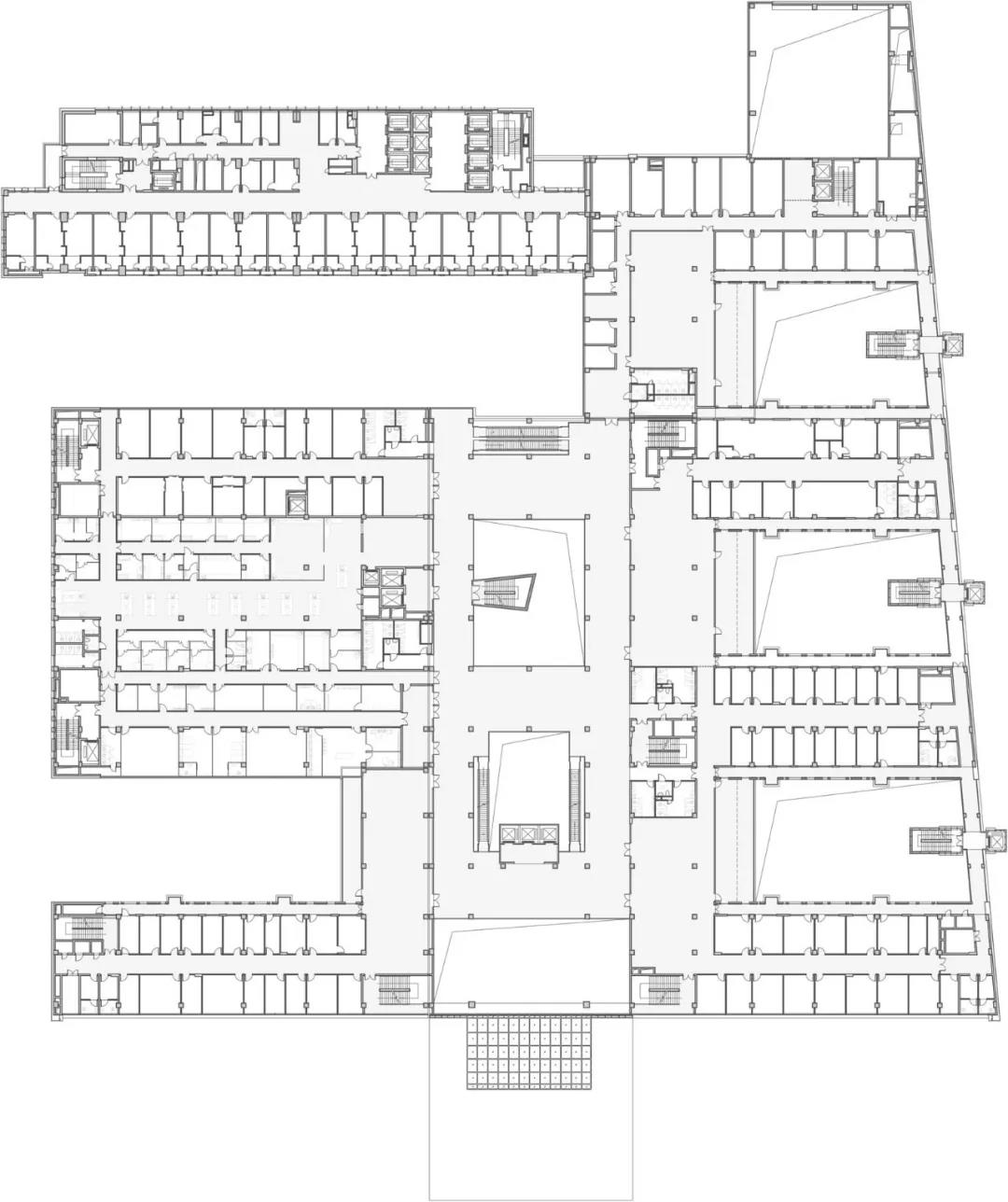 CAPOL負(fù)責(zé)進(jìn)行從方案到施工圖全過(guò)程的建筑設(shè)計(jì)總承包工作,創(chuàng)造性地采用“緊湊型三角形結(jié)構(gòu)”:以醫(yī)療技術(shù)部門為核心,門診部將布置在人流較多的城市主干道,住院部是遠(yuǎn)離城市主干道和噪音源的。三角形布局形成的最短會(huì)診、急救流線和分層掛號(hào)系統(tǒng),創(chuàng)造出了高效的就醫(yī)體驗(yàn)。
