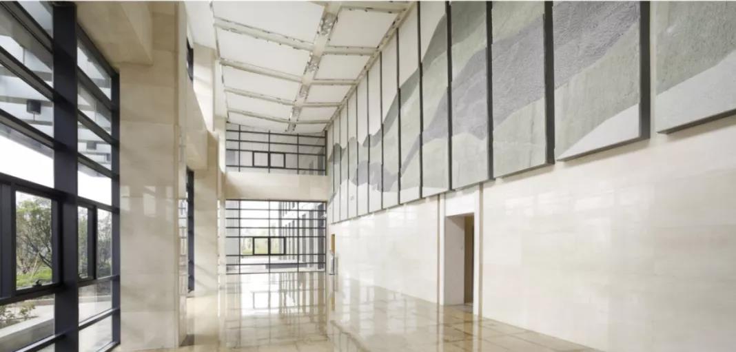 以當(dāng)代的藝術(shù)手法,將元素意象加以夸張放大,產(chǎn)生具有震撼力的效果,夸張的目的是為了突出事物的本質(zhì)特征 , 是在某種限度和原則指導(dǎo)下的夸大和強(qiáng)調(diào),以引起人們的共鳴,這種夸大的結(jié)果使人明白作品的“形”所強(qiáng)調(diào)的意義。如杭州市下沙醫(yī)院住院廳背景墻石材浮雕“富春山居”意境清和,悠閑自在,寧?kù)o致遠(yuǎn),取材于元朝書畫家黃公望以杭州富春江為背景所創(chuàng)作的、被稱為“中國(guó)十大傳世名畫”之一的《富春山居圖》。