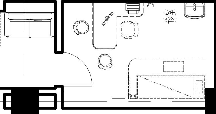 建議進(jìn)行標(biāo)準(zhǔn)化布置,以滿足基本診療的需求。向內(nèi)平開(kāi)門(mén)并靠深側(cè)墻,門(mén)方向深側(cè)墻對(duì)側(cè)設(shè)置診桌,診桌后方同側(cè)墻距離1米以外處布置洗手盆,防止水外濺腐蝕診桌。建議使用感應(yīng)式水龍頭設(shè)置,洗手盆下水管做U型彎方便檢修,洗手盆下做美觀的裝飾柜。水池上方30-50厘米以上貼墻梳妝鏡,保證門(mén)診醫(yī)生以良好的形象服務(wù)患者。檢查診床設(shè)置在洗手盆對(duì)側(cè)深側(cè)貼墻擺放,婦產(chǎn)科、耳鼻喉科、眼科等檢查床(椅)設(shè)備可布置在同側(cè),朝向可根據(jù)醫(yī)生診療習(xí)慣布置。檢查床必須設(shè)置隔簾,保護(hù)隱私??照{(diào)出風(fēng)口宜設(shè)置在診室門(mén)上,且側(cè)送風(fēng)為最佳,可避免直吹醫(yī)生或患者,且保證室內(nèi)空氣循環(huán)。