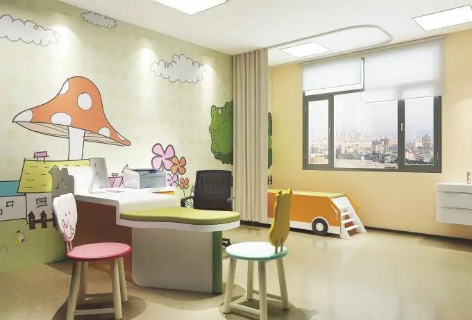 兒科可不設(shè)置二次候診區(qū),但建議在公共候診區(qū)設(shè)置符合院感和安全要求的小型休閑游樂(lè)場(chǎng);裝修涂料建材要求綠色環(huán)保,樣式以“卡通”人物或場(chǎng)景為主;診床和家具必須做圓弧處理或加防撞安全保護(hù),診床可選用玩具型家具床;可選擇不設(shè)置隔簾,減少兒童密閉恐懼感。
